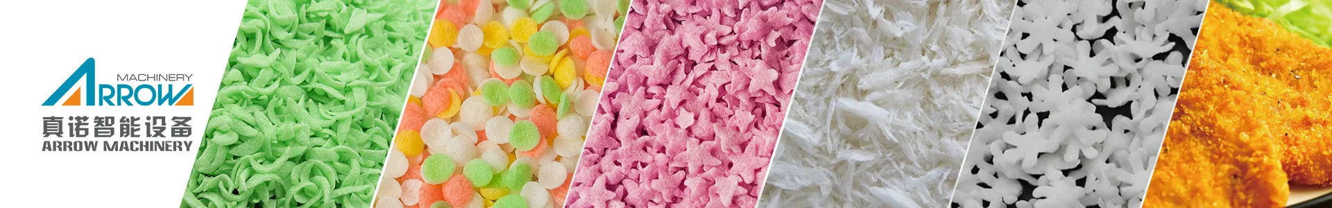 This process line is researched and developed on the basis of international advanced technology. The performance and quality have reached the highest domestic level of the same line. The line changes the traditional process. From mixing materials, extruding, cutting, drying to finished products are done in one automatic line. The Extruded Bread Crumbs are light and crispy with innovative shapes (small rings, crescent, small stars, balls, granule etc). They are widely used as food coating additives on the surface of frying food to obtain a very crispy and savory texture as well as unique and attractive fried foods’ golden color presentation.