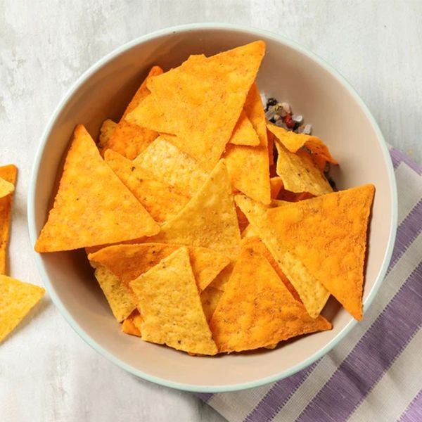 Doritos/Tortilla/Corn Chips are a classic snack made from corn flour, which is extruded, rolled, fried, and seasoned. The main ingredients are corn flour, water, vegetable oil, and salt. They are commonly made from yellow corn, but can also be made from white or red corn or wheat flour. After frying and seasoning, we get very crispy triangular, round, hexagonal, or other shapes of chips, which are popular with both children and adults.