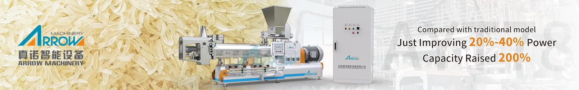 Product description: New technology can make up for the loss of micro-nutrients in traditional processing technology and strengthen the nutrtional value in rice food. The rice flour and broken rice are blended with vitamins and minerals,exreuded by extruder to retain vitamins and convenient.Leading the direction of future fast instant food products.Output:300-400kg/h, 600-800kg/h, 800-1000kg/h, 1500-2000kg/h.