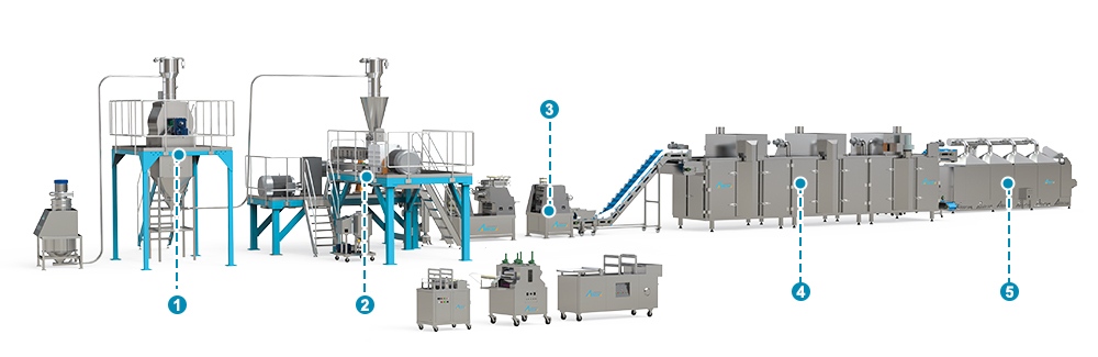 ① Mixing ② Extrusion puffing ③ Molding ④ Drying ⑤ Cooling