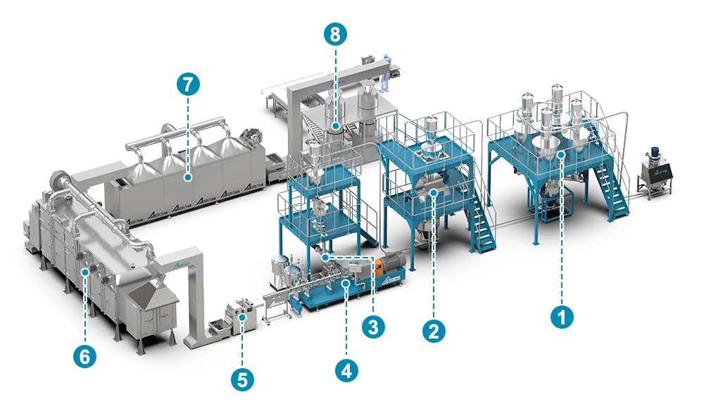 ① Ingredient preparation ② Mixing ③ Conditioning ④ Extrusion ⑤ Molding ⑥ Drying ⑦ Cooling ⑧ Packaging
