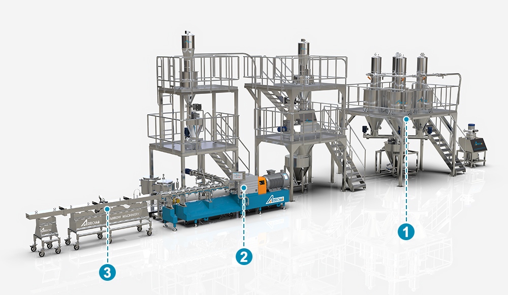 ① Ingredient mixing ② Extrusion puffing ③ Molding